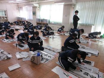 書写では書初めの練習です。広いスペースを使い、集中して「書」に取り組んでいます。