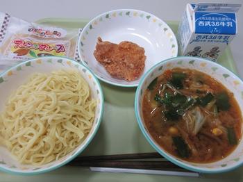 三年生の好きな味噌ラーメンと唐揚げです。最後の給食の白衣を身に付けて給食当番です。残った給食を担任が配ってくれるのも最後。
